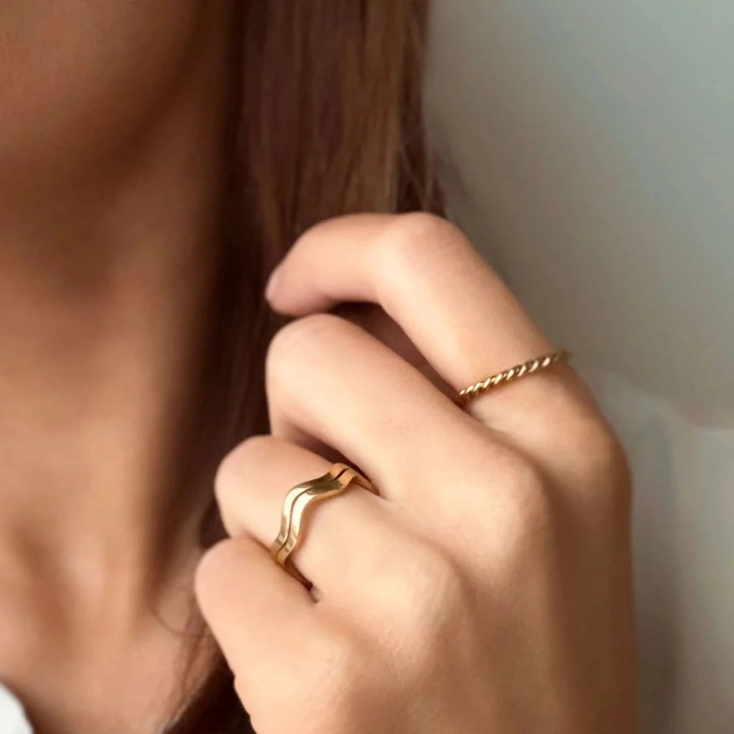Adrienne ring har en minimalistisk våginspirerad design som passar alla tillfällen. Bär en eller flera för att matcha din personliga stil. Tillverkad i rostfritt stål med en slitstark 14k guld PVD-plätering för överlägsen hållbarhet. Vattentålig och sweatproof, så du kan duscha, simma och träna utan problem.